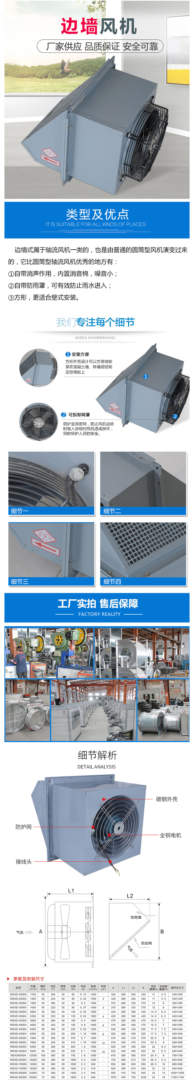 邊牆風機采用先進的前掠型葉片、低噪音的外轉子或(huò)內轉子風機專用電機直聯傳動,方形外殼設計可以方便地安裝在(zài)混凝土牆、磚牆或輕鋼壓型牆板上,方形防(fáng)雨罩結構牢固,外形美觀(guān)