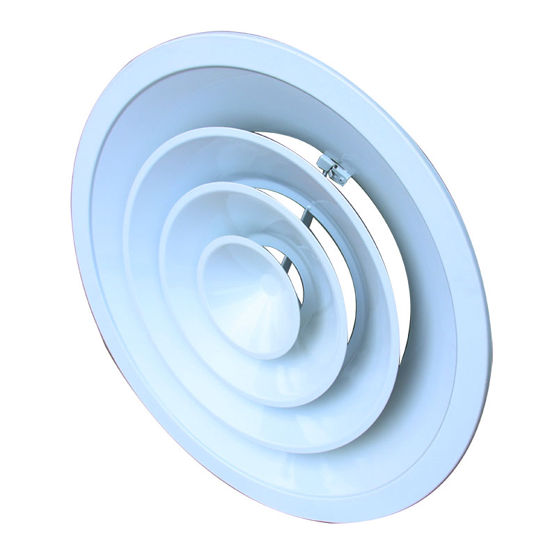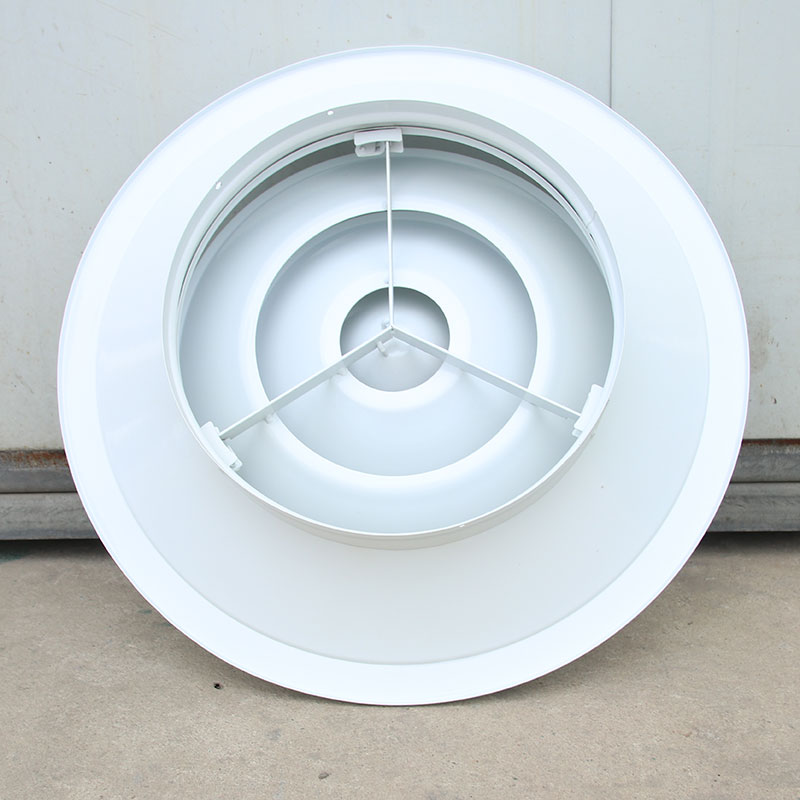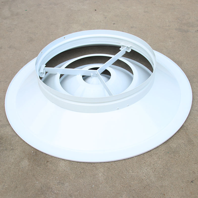 圓形散流器一般用於冷暖送風。通常安裝在頂(dǐng)棚上。其吹出氣流呈貼附(平送)型,其結構為(wéi)多層錐麵形。由於室內誘導氣(qì)流大於排風量,因此吹出氣流(liú)減速較(jiào)快。
